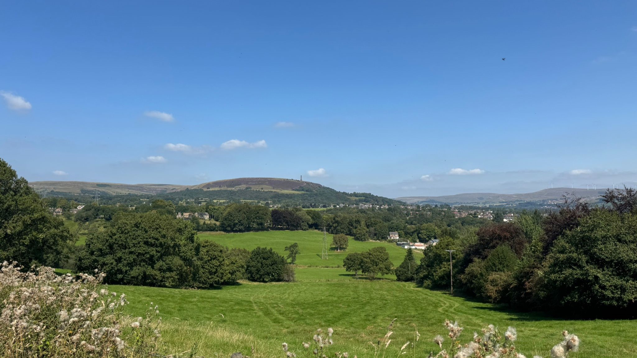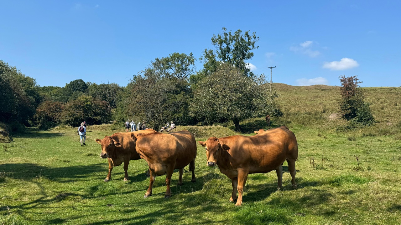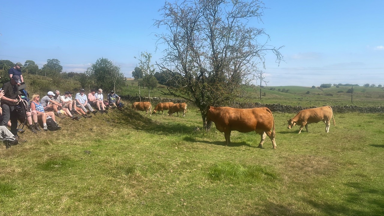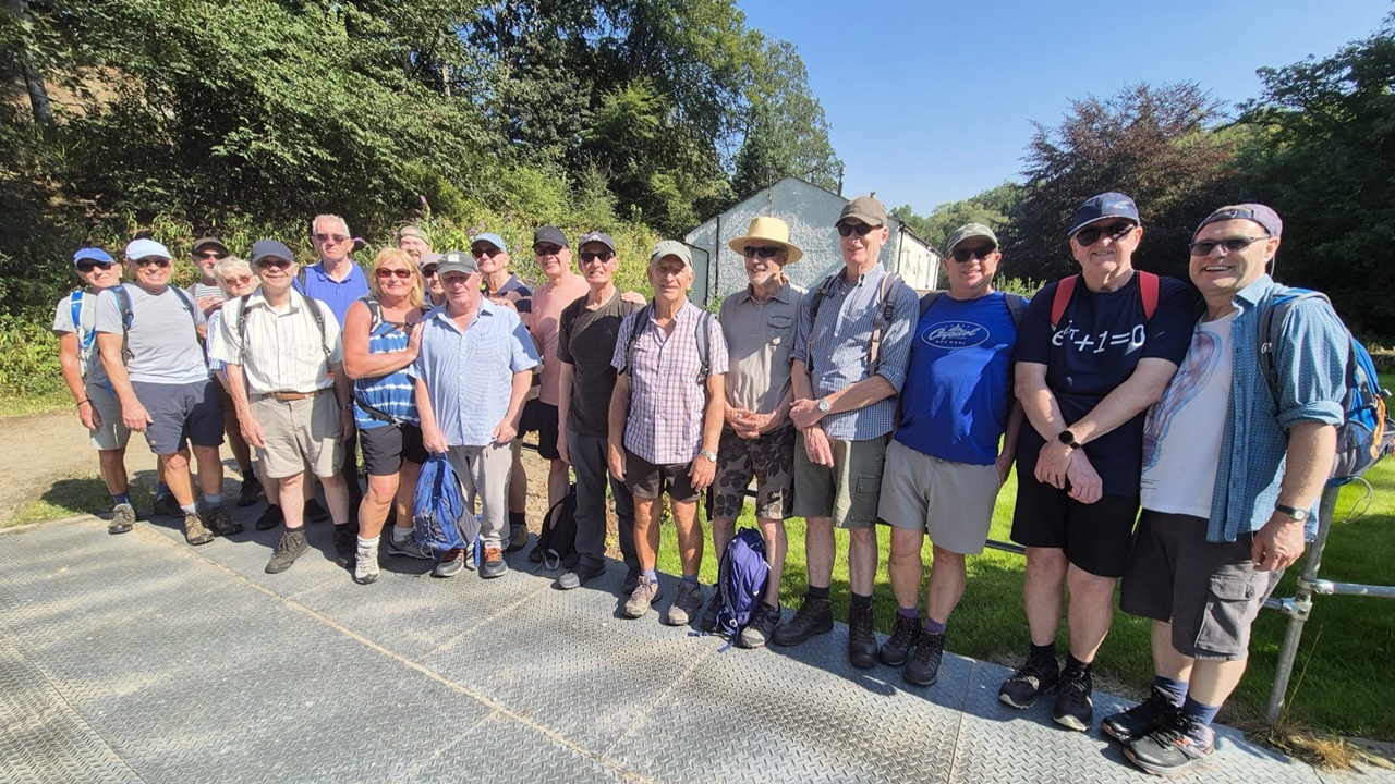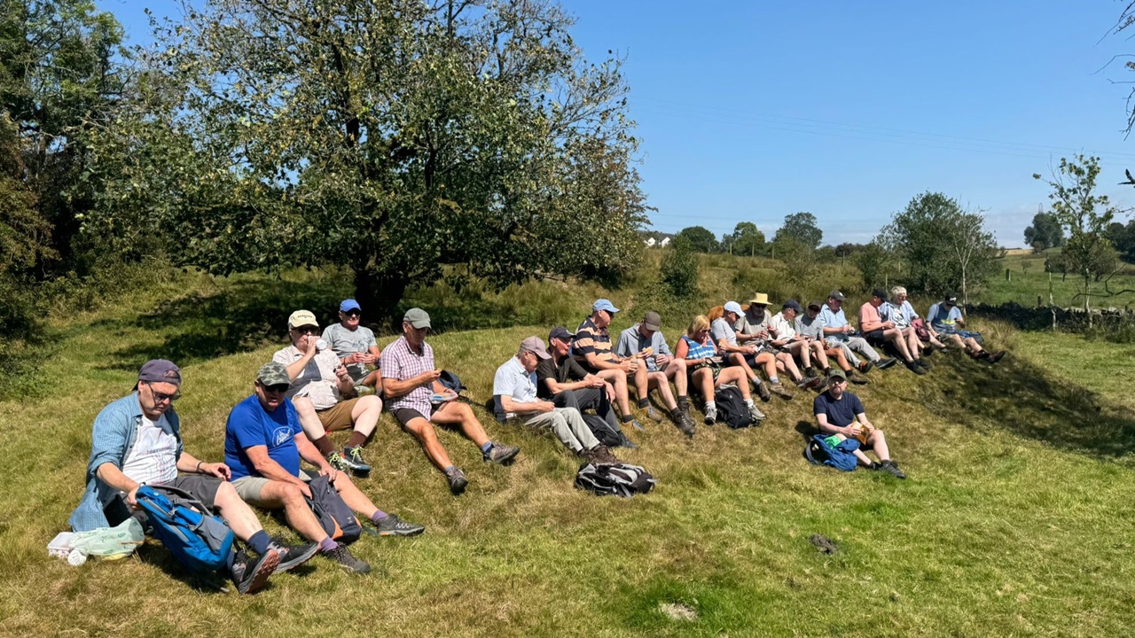 20 walkers joined Malcolm and John for this picturesque walk on a beautiful summer’s day – blue skies and a gentle breeze made it a perfect walking day. The circular walk from Tottington village followed the Two Brooks Valley and its extension north of Hawkshaw village with fine views of nearby Holcombe Moor. We returned via Croitchly Fold hamlet, Holly Mount and Bottoms Hall. The walk ended with a well earned beer at the atmospheric Dungeon Inn with its interesting friezes picturing the local area.